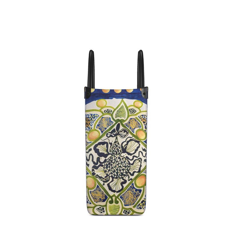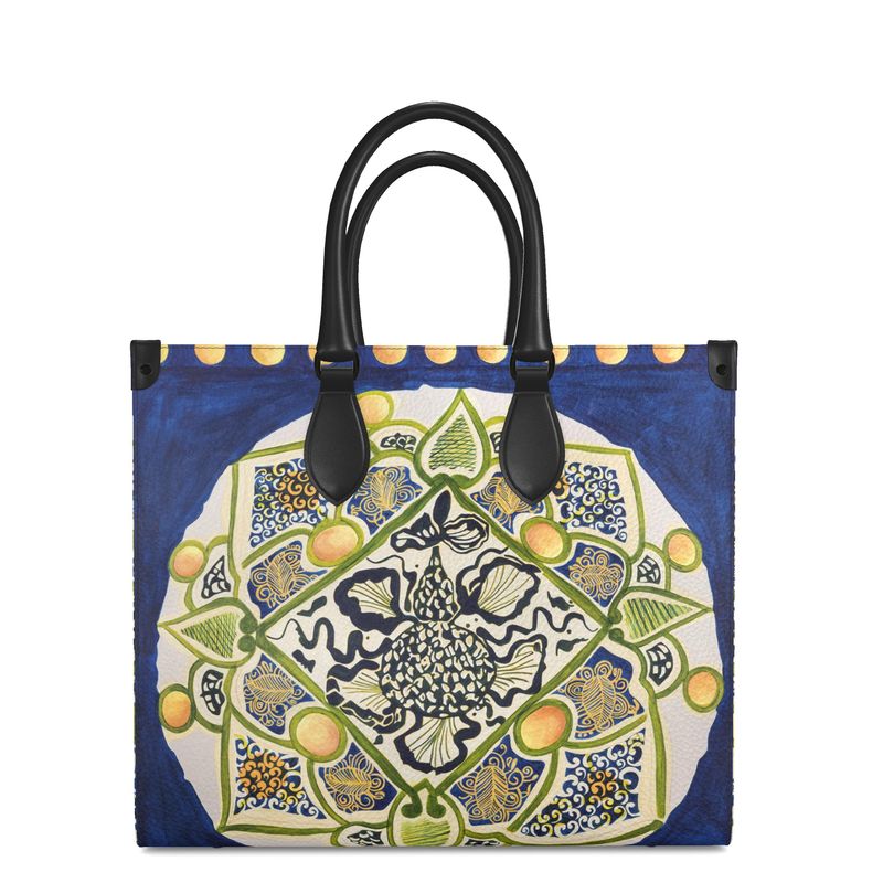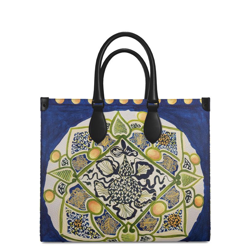 Step into everyday elegance with the Golden Bag, a stunning shopper made from 100% luxurious Nappa leather, adorned with original artwork by Kate Toledo. Each bag is a wearable canvas, brought to life by the hands of expert leatherworkers in a celebration of craftsmanship and creativity.Designed for both beauty and durability, the Golden Bag features smooth black Nappa handles and reinforced stud tabs to protect the leather. It's more than just a stylish statement, it’s a sustainable alternative to single-use bags, made to be used and admired again and again.A masterpiece of leatherworking and artistic expression, the Golden Bag is where fashion meets purpose and art walks with you.