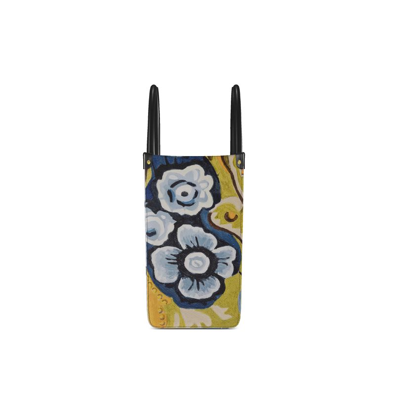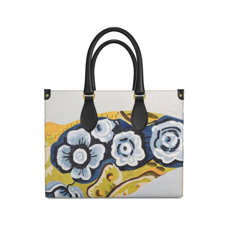 Discover the Mia bag, a compact shopper bag crafted from the finest Nappa leather and adorned with artwork by Kate Toledo. Meticulously handcrafted by skilled artisans, this small-sized bag is a celebration of elegance, artistry, and timeless design. Mia features sleek black Nappa leather handles and subtle studded tabs at the corners and base, ensuring both structure and sophistication. Its refined silhouette and striking visual detail make it a standout accessory, perfectly proportioned for day-to-night luxury. More than a bag, it’s a collectible expression of craftsmanship and creative vision.