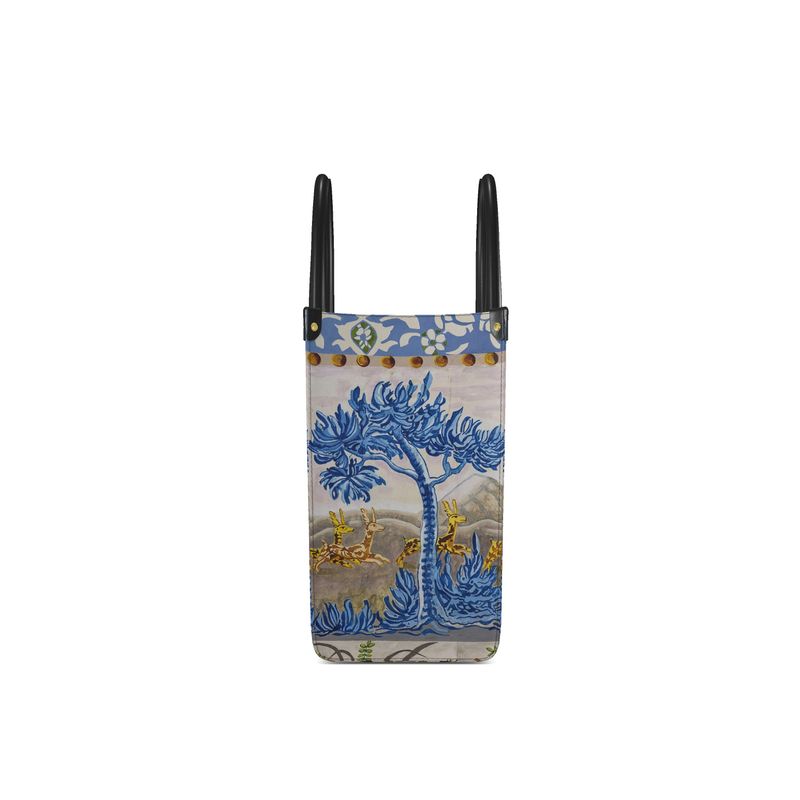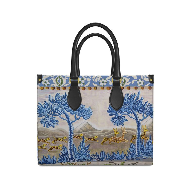 Discover the Mia bag, a compact shopper bag crafted from the finest Nappa leather and adorned with artwork by Kate Toledo. Meticulously handcrafted by skilled artisans, this small-sized bag is a celebration of elegance, artistry, and timeless design. Mia features sleek black Nappa leather handles and subtle studded tabs at the corners and base, ensuring both structure and sophistication. Its refined silhouette and striking visual detail make it a standout accessory, perfectly proportioned for day-to-night luxury. More than a bag, it’s a collectible expression of craftsmanship and creative vision.