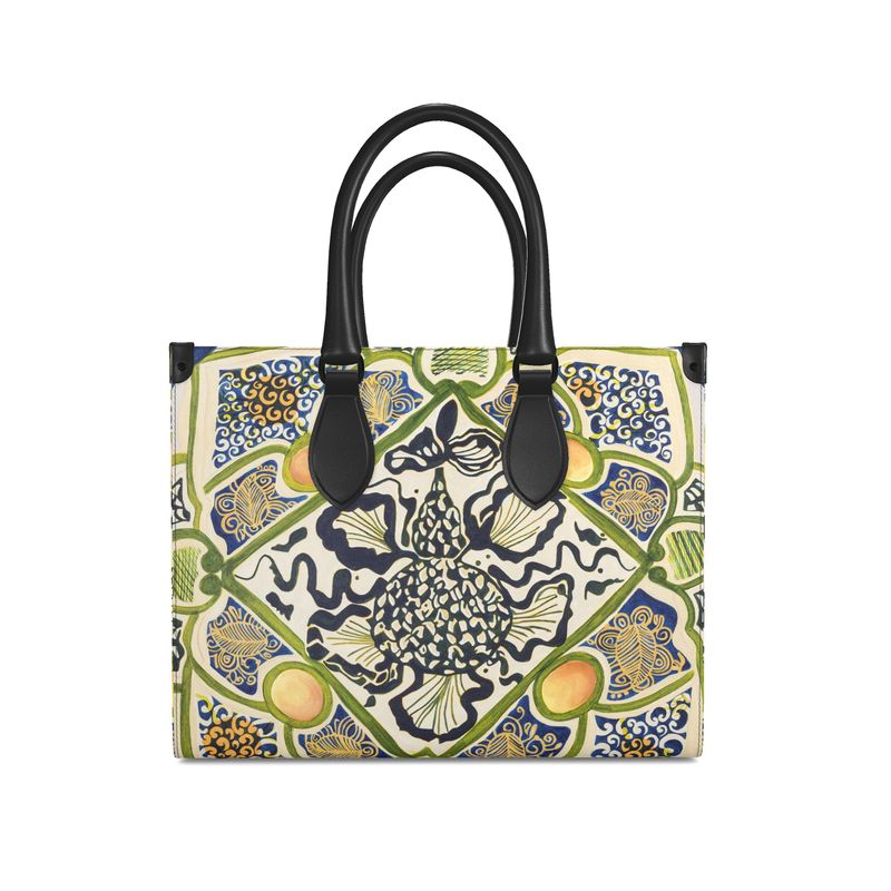 Discover the Mia bag, a compact shopper bag crafted from the finest Nappa leather and adorned with artwork by Kate Toledo. Meticulously handcrafted by skilled artisans, this small-sized bag is a celebration of elegance, artistry, and timeless design. Mia features sleek black Nappa leather handles and subtle studded tabs at the corners and base, ensuring both structure and sophistication. Its refined silhouette and striking visual detail make it a standout accessory, perfectly proportioned for day-to-night luxury. More than a bag, it’s a collectible expression of craftsmanship and creative vision.